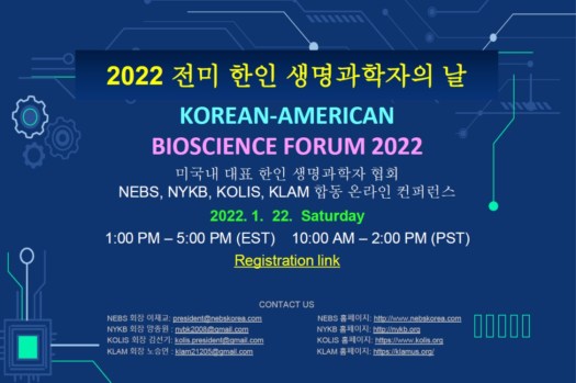 KLAM은 NEBS(보스턴지역), NYKB(뉴욕지역), KOLIS(San Fransisco Bay지역) 한인단체와 함께 보건산업진흥원 미국지사 후원을 통해 ‘전미생명과학자의날’ 행사를 온라인으로 개최하게 되었습니다. 개최 일시는 1월 22일 1-5PM (EST)입니다. 각 단체 별로 두 분씩 총 여덟 분이 선정되어 각 25분간 연구발표를 진행하고 breakout room에서 QnA 및 네트워킹시간도 가질 예정입니다. 타 지역의 연구자분들과도 소통할 수 있는 좋은 기회가 되리라 생각합니다.